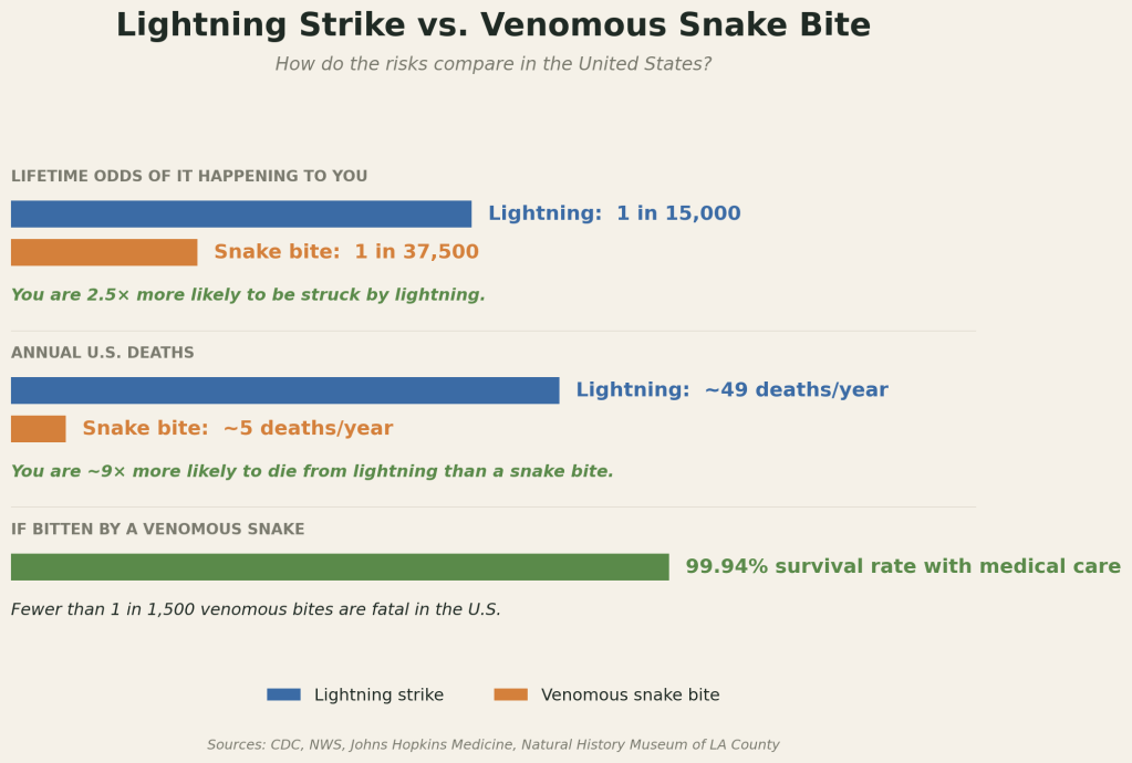 Put that against the 75 million Americans who go hiking annually, and the risk of a venomous bite on any given hike is tiny. Your lifetime odds of a venomous snake bite sit around 1 in 37,500. Your lifetime odds of being struck by lightning? About 1 in 15,000. You are more than twice as likely to be hit by lightning as bitten by a venomous snake, and about nine times more likely to die from a lightning strike than from a bite. The Natural History Museum of Los Angeles County points out that rattlesnakes kill fewer Americans each year than ladders, falling televisions, or domestic dogs.